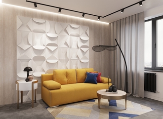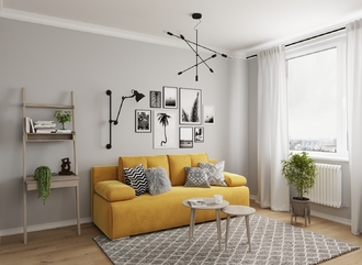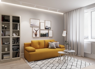 Спинка, выполненная в обивочной ткани, позволяет ставить диван в центре комнаты и зонировать пространство.
