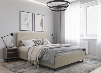 MOON FAMILY 1257 привлекает внимание оригинальным исполнением: широкие полосы ткани эффектно пересекают периметр изголовья, создавая на нем графический орнамент. Лаконичные формы объемных царг создают единый гармоничный образ и фокусируют внимание на центральном текстурном элементе кровати.