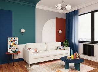 Спинка, выполненная в обивочной ткани, позволяет ставить диван в центре комнаты и зонировать пространство.