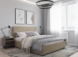 MOON FAMILY 1257 привлекает внимание оригинальным исполнением: широкие полосы ткани эффектно пересекают периметр изголовья, создавая на нем графический орнамент. Лаконичные формы объемных царг создают единый гармоничный образ и фокусируют внимание на центральном текстурном элементе кровати.