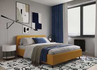 Царга, задающая пропорции, благодаря гладкости своей фактуры подчеркивает центральный элемент декора. Высокие опоры приподнимают фигуру кровати над полом и добавляют её образу визуальной легкости.