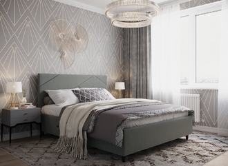 MOON FAMILY 1257 привлекает внимание оригинальным исполнением: широкие полосы ткани эффектно пересекают периметр изголовья, создавая на нем графический орнамент. Лаконичные формы объемных царг создают единый гармоничный образ и фокусируют внимание на центральном текстурном элементе кровати.