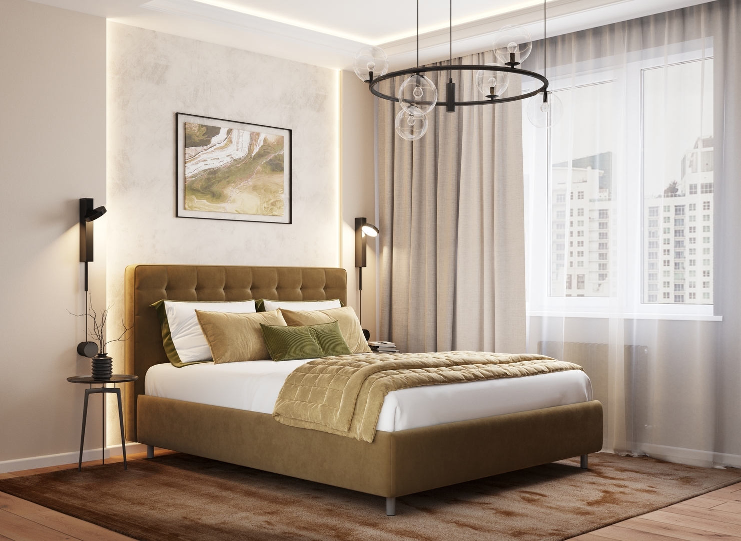 Оформите образ кровати, выбирая обивочный материал, который подчеркнет звучание Вашей спальни и отразит Ваш вкус. Обратите внимание на однотонный гладкий велюр, который усиливает объемную фактуру стежки.
