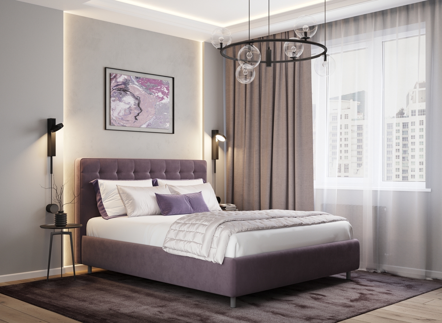 Оформите образ кровати, выбирая обивочный материал, который подчеркнет звучание Вашей спальни и отразит Ваш вкус. Обратите внимание на однотонный гладкий велюр, который усиливает объемную фактуру стежки.