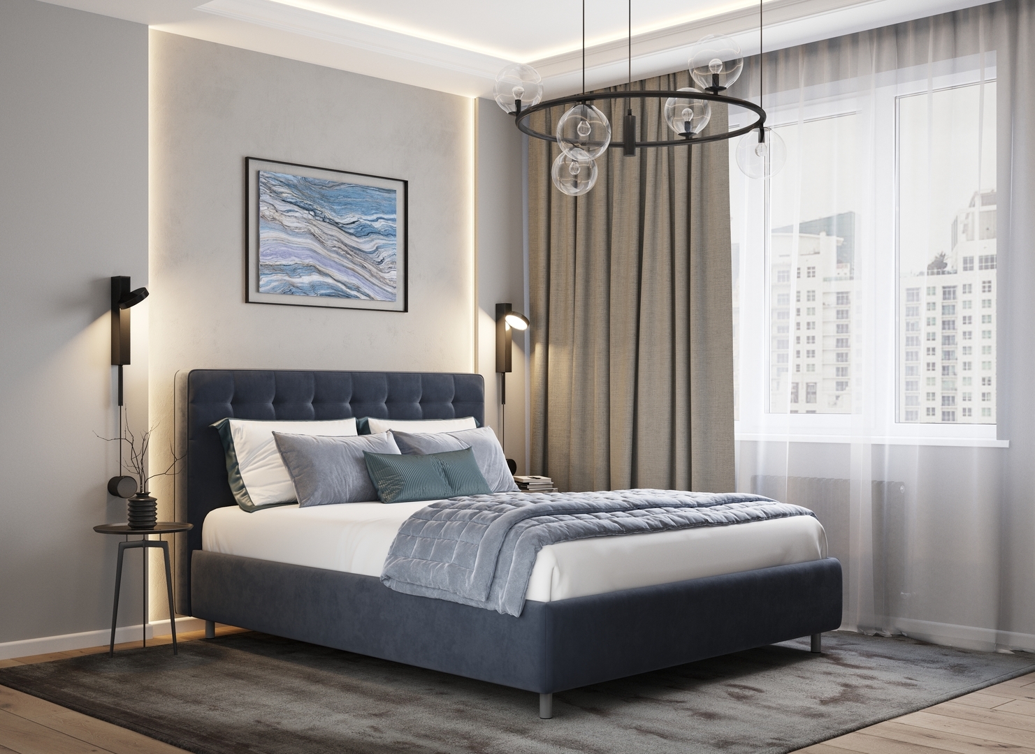 Оформите образ кровати, выбирая обивочный материал, который подчеркнет звучание Вашей спальни и отразит Ваш вкус. Обратите внимание на однотонный гладкий велюр, который усиливает объемную фактуру стежки.