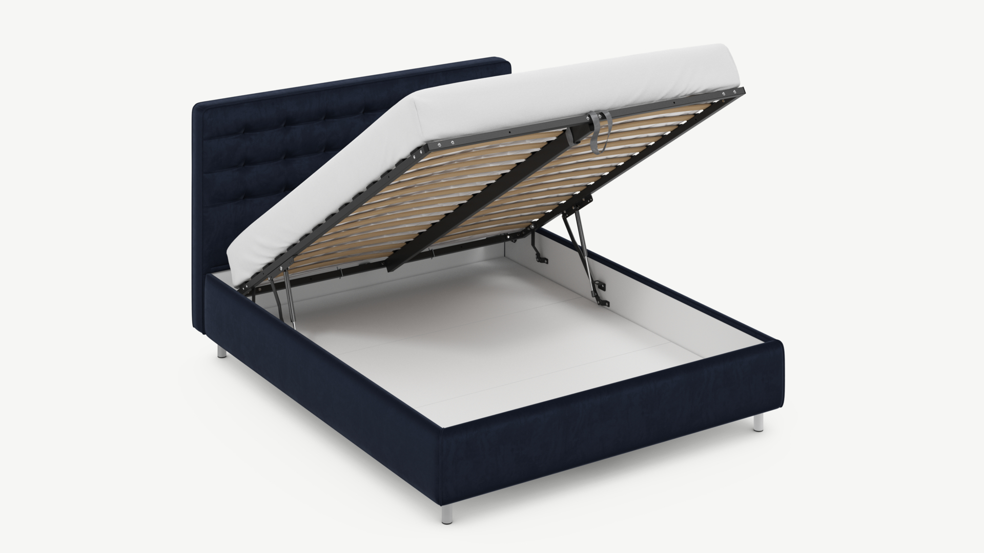 • Скрытая под основанием вместительная емкость без внутренних перегородок позволяет использовать всю площадь подкроватного пространства для хранения вещей.