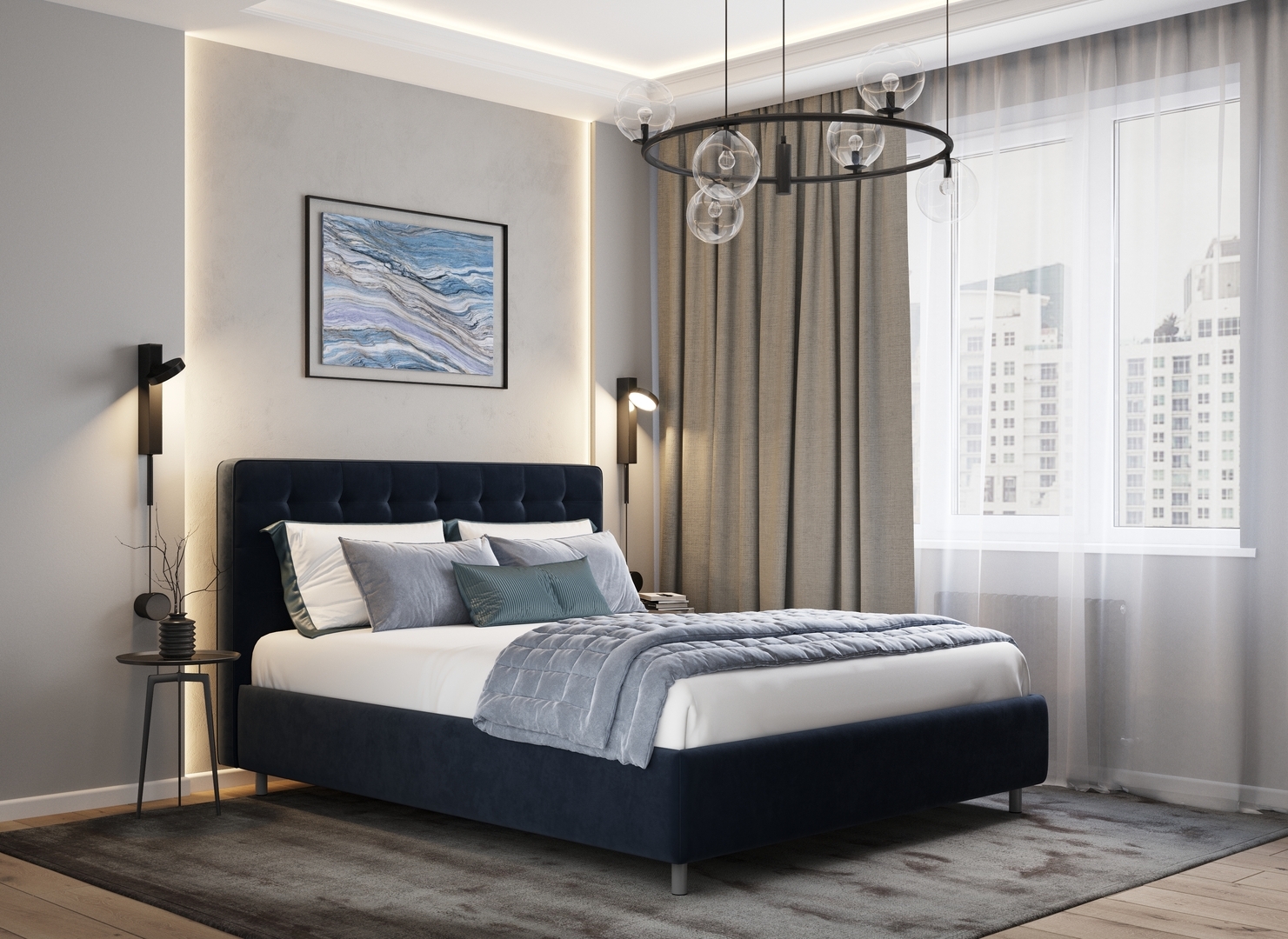 Оформите образ кровати, выбирая обивочный материал, который подчеркнет звучание Вашей спальни и отразит Ваш вкус. Обратите внимание на однотонный гладкий велюр, который усиливает объемную фактуру стежки.